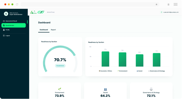 ESG Readiness Assessment is an AI-powered solution that simplifies ESG assessment. Register your profile, complete our readiness survey, and receive an overall ESG score, key strengths, identified gaps, and tailored recommendations.